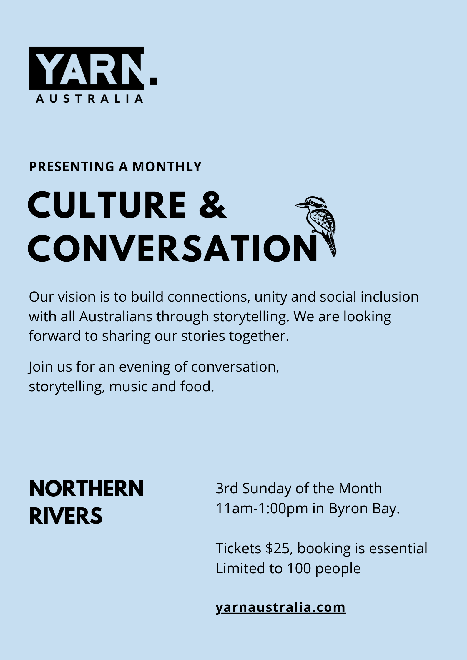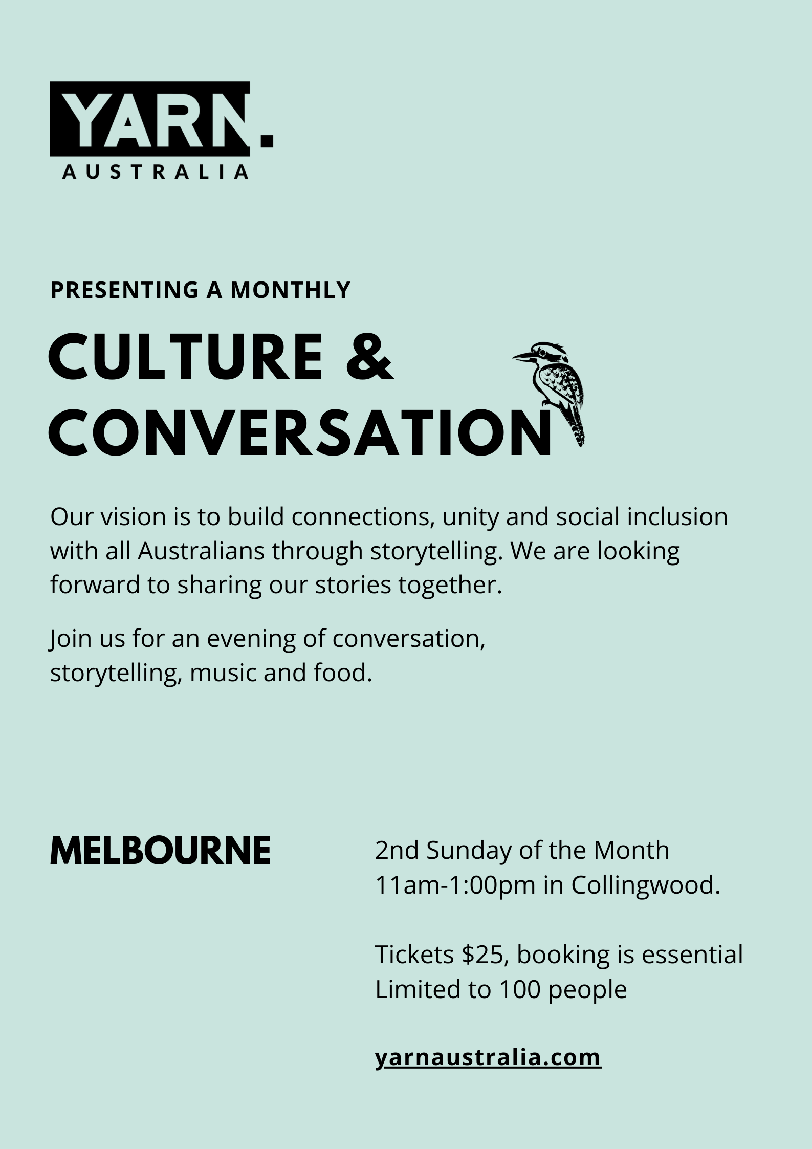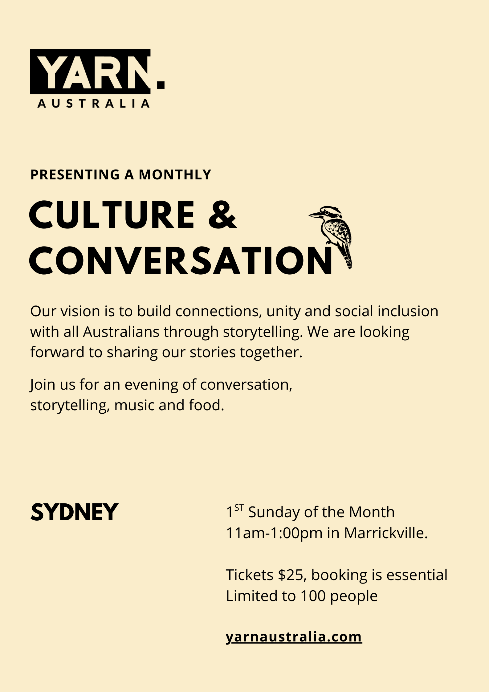 Each Culture & Conversation event is limited to 100 Participants at $25 per person for a total cost of $2,500. Please send us an email at info@yarnaustralia.com to schedule an Online Meeting via Zoom to discuss further of when you would like to make a booking.